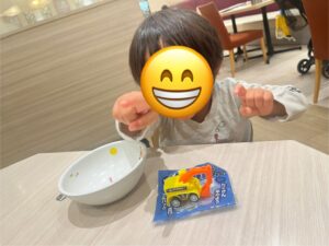 一方その頃、息子はオマケのおもちゃで大満足…。