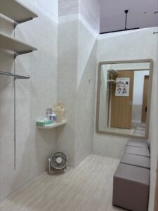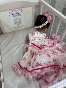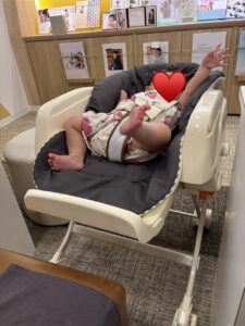赤ちゃんの待合スペースには、しっかりした木製のベビーベッドがあり、安心して赤ちゃんを寝かせて着替えや休憩ができました。