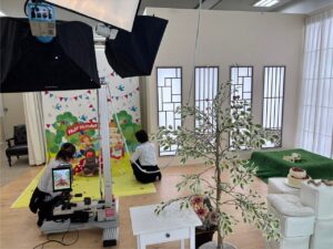 ブログ紹介用に、特別にスタジオの雰囲気を撮影させてもらいました。ロールスクリーンや窓風の背景、芝生などのグリーンも。