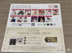 そして、その中に入っていたスタジオアリスの記念撮影優待券。撮影料金とオリジナルアルバム。そして大きな四つ切り写真がサービスされて、とってもお得にスタジオアリスの高品質な写真撮影が楽しめます。