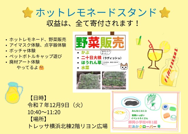 今回はなんとホットレモネードスタンドや野菜の販売も行って、その収益を寄付するんですって!レモネード、とっても気になる~!