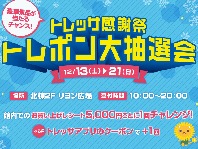 レシート対象期間の館内でのお買い上げレシート5000円(複数日・複数店舗の合算可)ごとに1回チャレンジできます♪さらにトレッサアプリのクーポンでプラス1回!