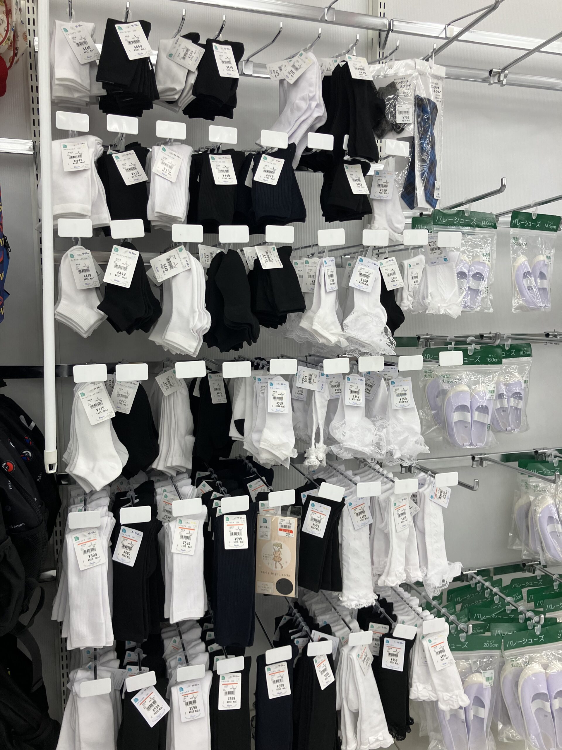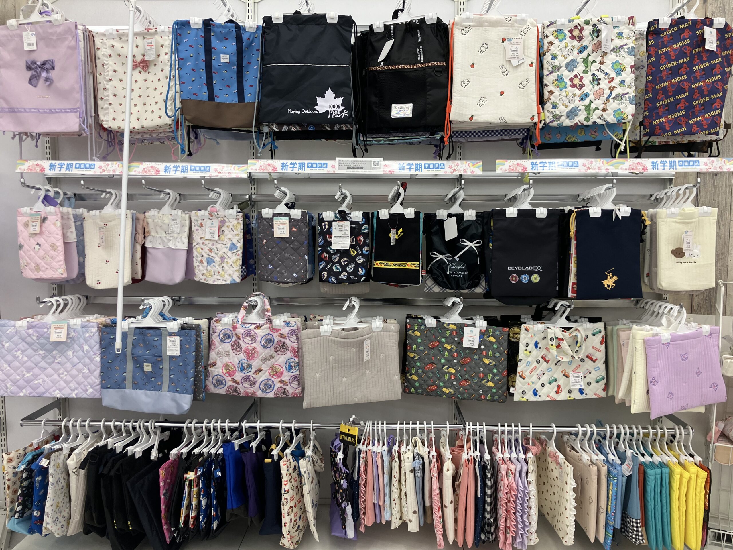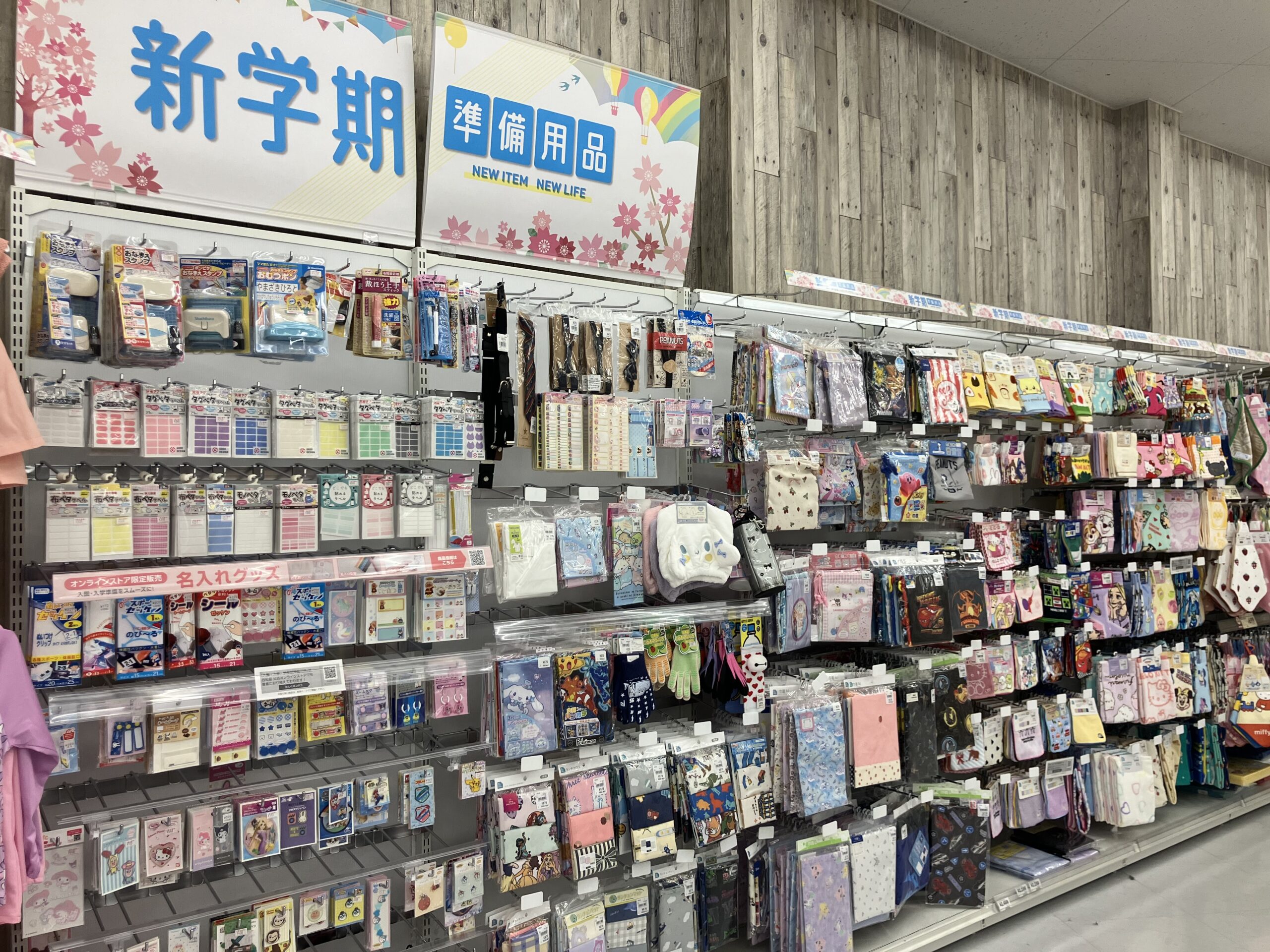 お店の奥にも【新学期準備用品】コーナーがありました。手提げや上履き入れ、巾着類にミニタオル、その他いろいろ小物が壁一面に並んでいます♪