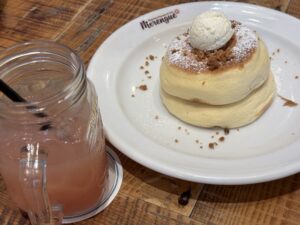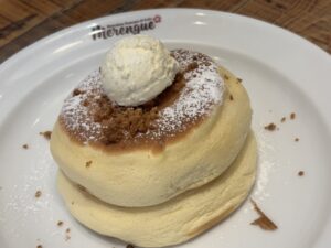 前回わたしはフルーツたっぷりの華やかなパンケーキにしましたが、今回は生地そのものの味を楽しみたくてプレーンをチョイス。口の中でシュワっと溶けるふわふわ食感は、家では絶対マネできないプロの技です…!