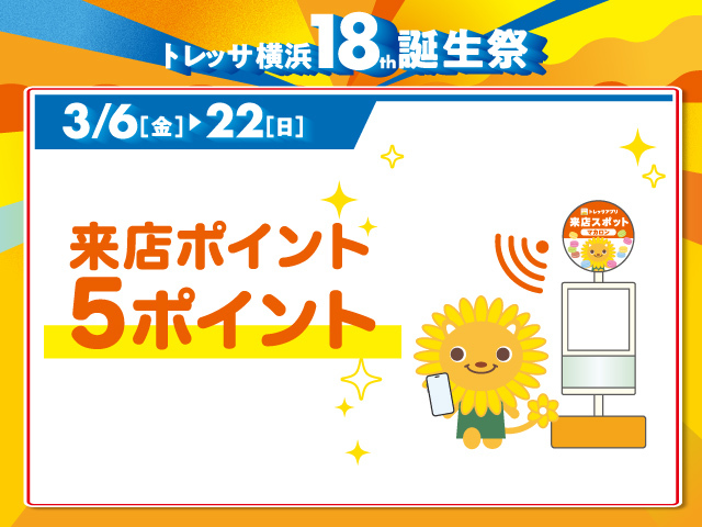 トレッサアプリの来店ポイント、通常1ポイントが期間限定で5ポイントになります。南棟、北棟それぞれにある来店スポットでチェックインしてポイントをGETしてください![]()
